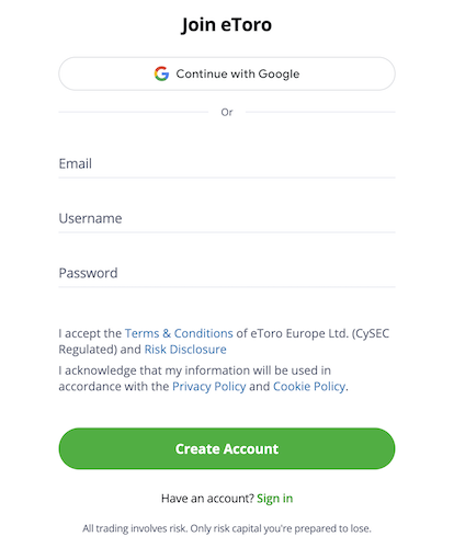 π Getting started with eToro is a streamlined process that takes just a few minutes. In this eToro review, we discovered that signing up is simple β users only need to enter their email, username, and a secure password to create an account. You can also register using Google or Facebook for faster access. Once registered, youβll be directed to the trading dashboard where youβll begin the identity verification process.