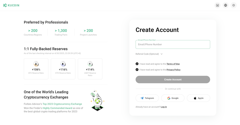 π² Getting started with KuCoin is easy. Users can register with just an email address or phone number, followed by a quick verification code. Once your account is created, you’re free to explore basic wallet features. However, to access higher withdrawal limits and advanced services, completing the KYC process is strongly recommended. As weβll note throughout this KuCoin review, identity verification unlocks important functions like fiat purchases, staking, and more.