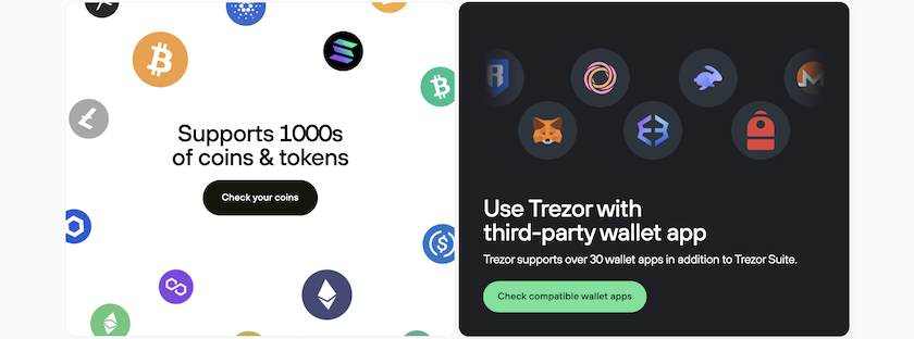 π Trezor supports more than 9,000 cryptocurrencies across both major blockchains and lesser-known tokens. Popular assets like Bitcoin (BTC), Ethereum (ETH), Litecoin (LTC), Dogecoin (DOGE), and Zcash (ZEC) are all compatible. Ethereum-based ERC-20 tokens are also fully supported through integrations with third-party wallets like MyEtherWallet and MetaMask. Any detailed Trezor review will emphasize this wide range of compatibility as a major advantage.