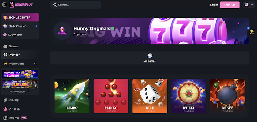 👍 HunnyPlay currently features 30+ Provably Fair games. Five of these are exclusive in-house originals, while the rest are sourced from trusted third-party developers like BGaming, Pragmatic Play, and Playson. The in-house originals include: