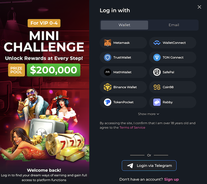 🕵️ Yes, you can register anonymously on HunnyPlay. Players have the option to sign up using their crypto wallets, Telegram, or email, making the process simple and privacy-friendly. Supported wallets include MetaMask, WalletConnect, TrustWallet, TON Connect, MathWallet, SafePal, Binance Wallet, Coin98, TokenPocket, Rabby, Phantom, Sollet, Solflare, Slope, BitKeep, and Clover. This wide variety of options ensures that every crypto enthusiast can join HunnyPlay in just a few clicks.