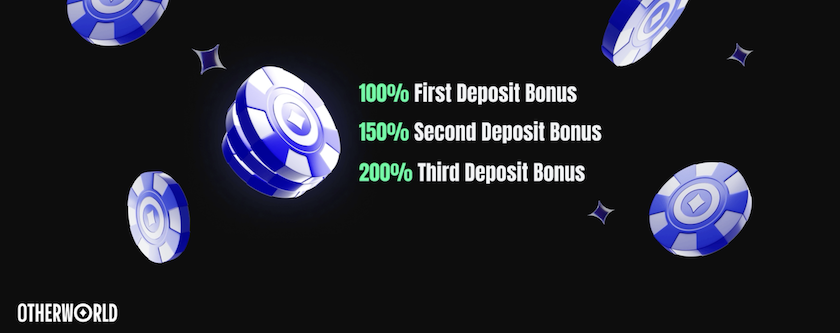 πŸ’Ž The Otherworld Casino welcome package is an impressive, three-stage bonus that gives players every reason to keep the fun going. Across your first three deposits, you can collect up to €3000 in total bonuses, with percentages that increase at each step β€” making your third deposit especially rewarding!